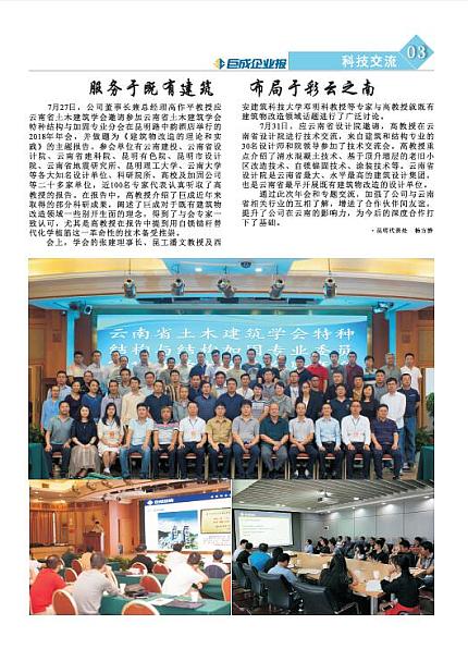 7月27日,公司董事长兼总经理高作平教授应云南省土木建筑学会邀请参加云南省土木建筑学会特种结构与加固专业分会在昆明路中韵酒店举行的2018年年会,并做题为《建筑物改造的理论和实践》的主题报告。参会单位有云南建投、云南省设计院、云南省建科院、昆明有色院、昆明市设计院、云南省地震研究所、昆明理工大学、云南大学等各大知名设计单位、科研院所、高校及加固公司等二十多家单位,近100名专家代表认真听取了高教授的报告。在报告中,高教授介绍了九游会J9真人游戏第一品牌近年来取得的部分科研成果,阐述了九游会J9真人游戏第一品牌对于既有建筑物改造领域一些别开生面的理念,得到了与会专家一致认可,尤其是高教授在报告中提到用自锁锚杆替代化学植筋这一革命性的技术备受推崇。