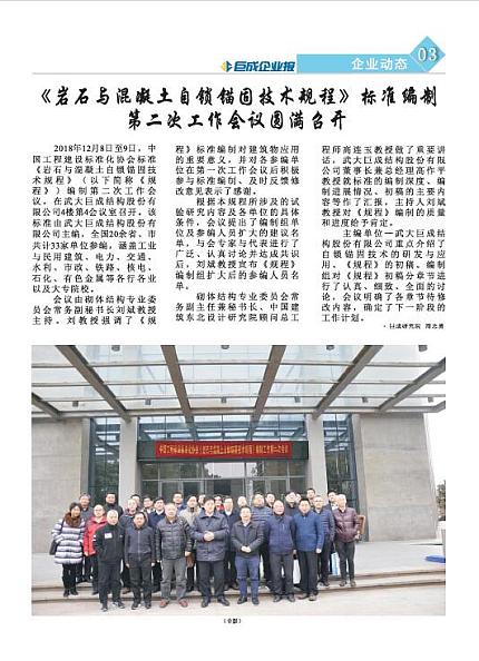 2018年12月8日至9日,中国工程建设标准化协会标准《岩石与混凝土自锁锚固技术规程》(以下简称《规程》)编制第二次工作会议,在武大九游会J9真人游戏第一品牌结构股份有限公司4楼第4会议室召开。该标准由武大九游会J9真人游戏第一品牌结构股份有限公司主编,全国20余省、市共计33家单位参编,涵盖工业与民用建筑、电力、交通、水利、市政、铁路、核电、石化、有色金属等各行各业以及大专院校。