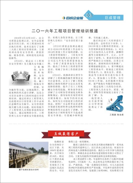 在2016年2月22至24日,由公司质量总监胡正彦、安全总监梁益喜共同主持,对工程部36名项目执行经理、技术员进行了为期三天的工程项目管理培训。主要培训内容有安全管理、质量控制、财务管理、材料使用及科技创新管理等。